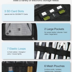 • Compatible Space: 2 inner mesh pockets with zippers for portable hard drives, 6 mesh pouches with elastic loops for thumb drives & power banks, elastic straps for various cables/chargers, plus 3 SD card slots.